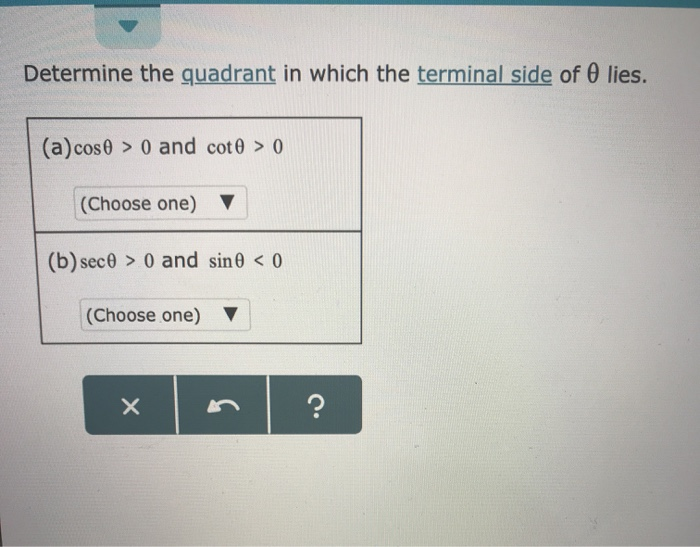 Quadrant III or on the negative x-axis OB. Determine the quadrant in which the terminal side of angle θ liescos θ 0 and csc θ 0. And we have to determine the quadrants in which the terminal side of the state allies subjected to the given to conditions.
